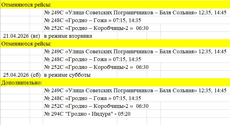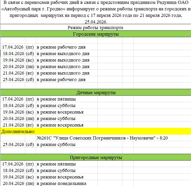 В связи с переносами рабочих дней в связи с предстоящим праздником Радуница ОАО «Автобусный парк г. Гродно» информирует о режиме работы транспорта на городских и пригородных  маршрутах на период c 17 апреля 2026 года по 21 апреля 2026 года, 25.04.2026.